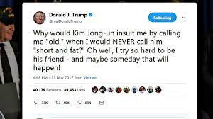 The Asian Tour not only brought about fake news concerning Trump and Russia, it also discussed Kim Jung-un calling him an old man. This was not necessarily fake news however, it goes right along with his reactions to fake news. Trump tweets about what the media says. Sometimes it seems slightly immature. Its not that he is tweeting about the wrong things, it is the way he does it. He is avidly against fake news. However, just like parents say, sometimes it is best to say nothing at all.